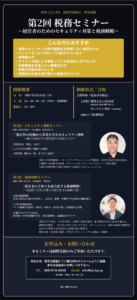 数字のプロ×識学の経営理論携えて挑んだM&A~同業の買収で気づいた5つの盲点~ 開催の詳細はこちら 【セミナー登壇】中小企業税務経営研究協会主催「経営戦略セミナー」 【freee×税理士法人ISJ】クラウド会計を活用した会計事務所の「業務効率化」 関連記事 終了 【11/26開催】【顧問先様限定】第二回 税務セミナー 経営者のためのセキュリティ対策と税務戦略 2025年11月17日2025年11月25日 終了 【11/4開催】【freee×税理士法人ISJ】クラウド会計を活用した会計事務所の「業務効率化」 2025年11月4日2025年11月18日 終了 AIに仕事を奪われる時代に、年収1000万円を実現する税理士の条件 2025年10月20日2025年11月17日 終了 【freee×税理士法人ISJ】クラウド会計を活用した会計事務所の「業務効率化」 2025年9月13日2025年11月17日 終了 【セミナー登壇】中小企業税務経営研究協会主催「経営戦略セミナー」 2025年6月13日2025年11月17日